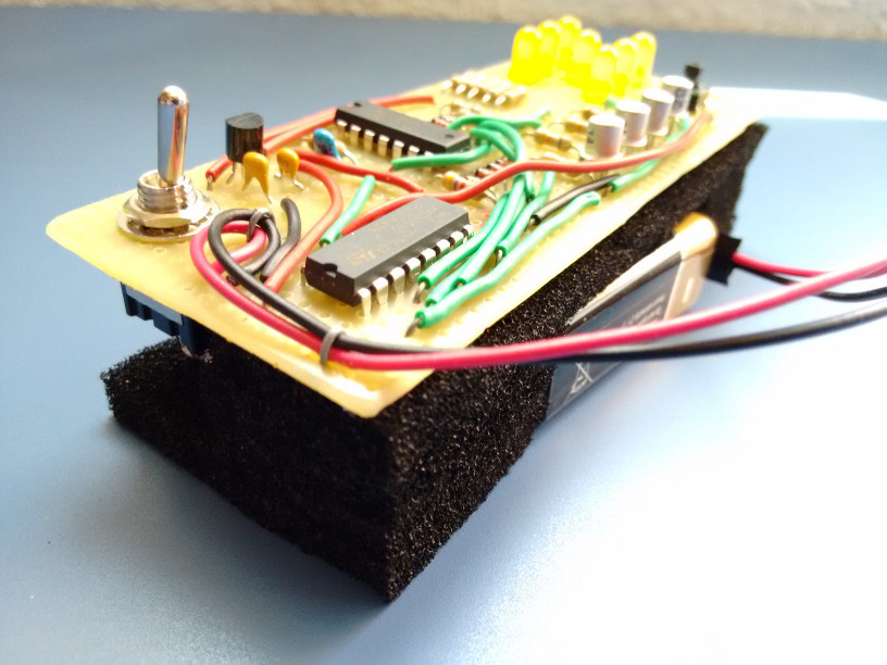 The circuit uses a 9 V battery. The logic of the circuit needs about 11 mA, and the LEDs need around 9 mA each. That means it uses from 20 mA (when only 1 LED is on) to 65 mA (when 6 LEDs are on). The 7 LEDs can’t be turned on at the same time, obviously.