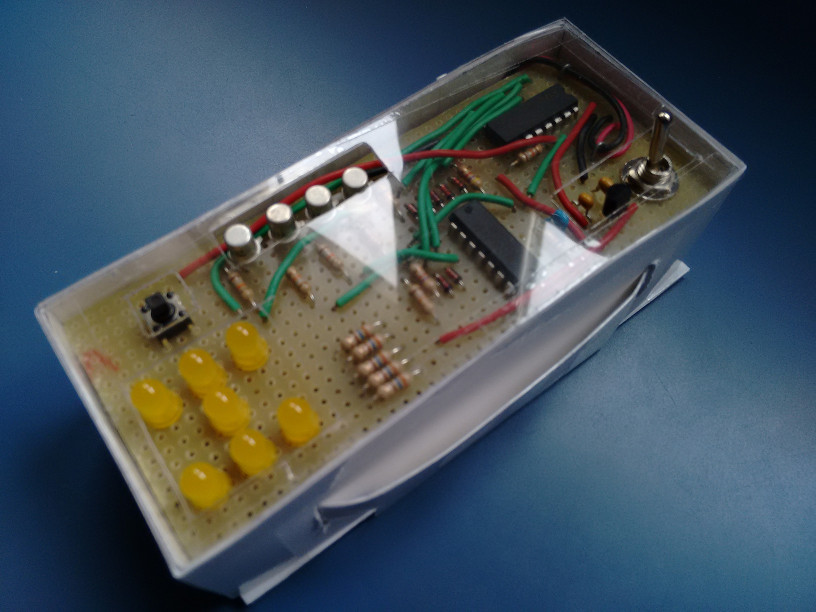 Well, after a few weeks not doing almost anything I’ve decided to post the last useless device I’ve made. It’s a simple electronic dice using a decade counter and some inverters (used for logic and as oscillator). I decided not to use a microcontroller because it felt like it was cheating for a circuit this simple… There’s not much to say: pressing the button will enable the counter and releasing the button will stop it and show a “random” number. The counter is very fast so it’s impossible to guess what number is going to show when the button is released. Here are a few pictures: