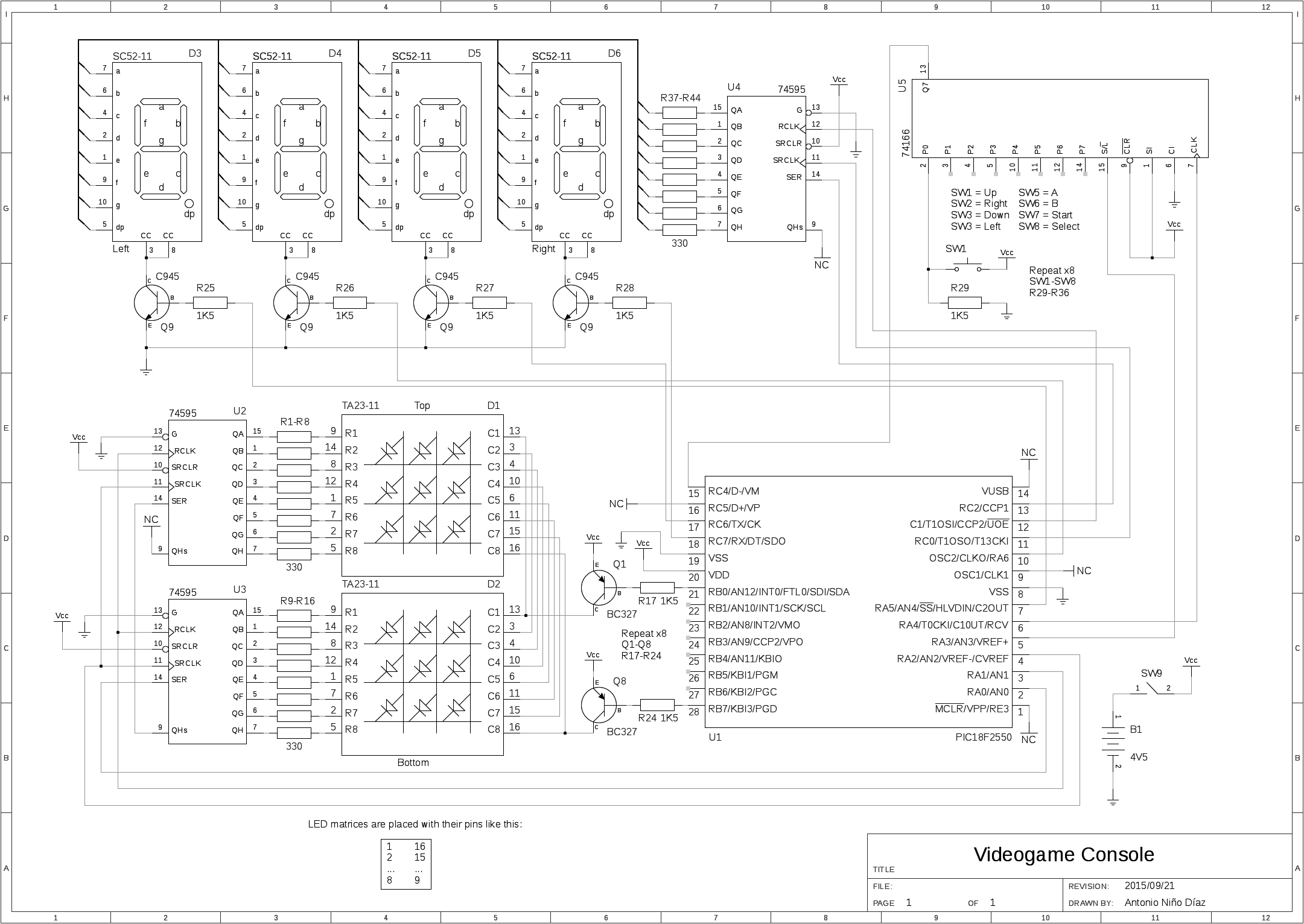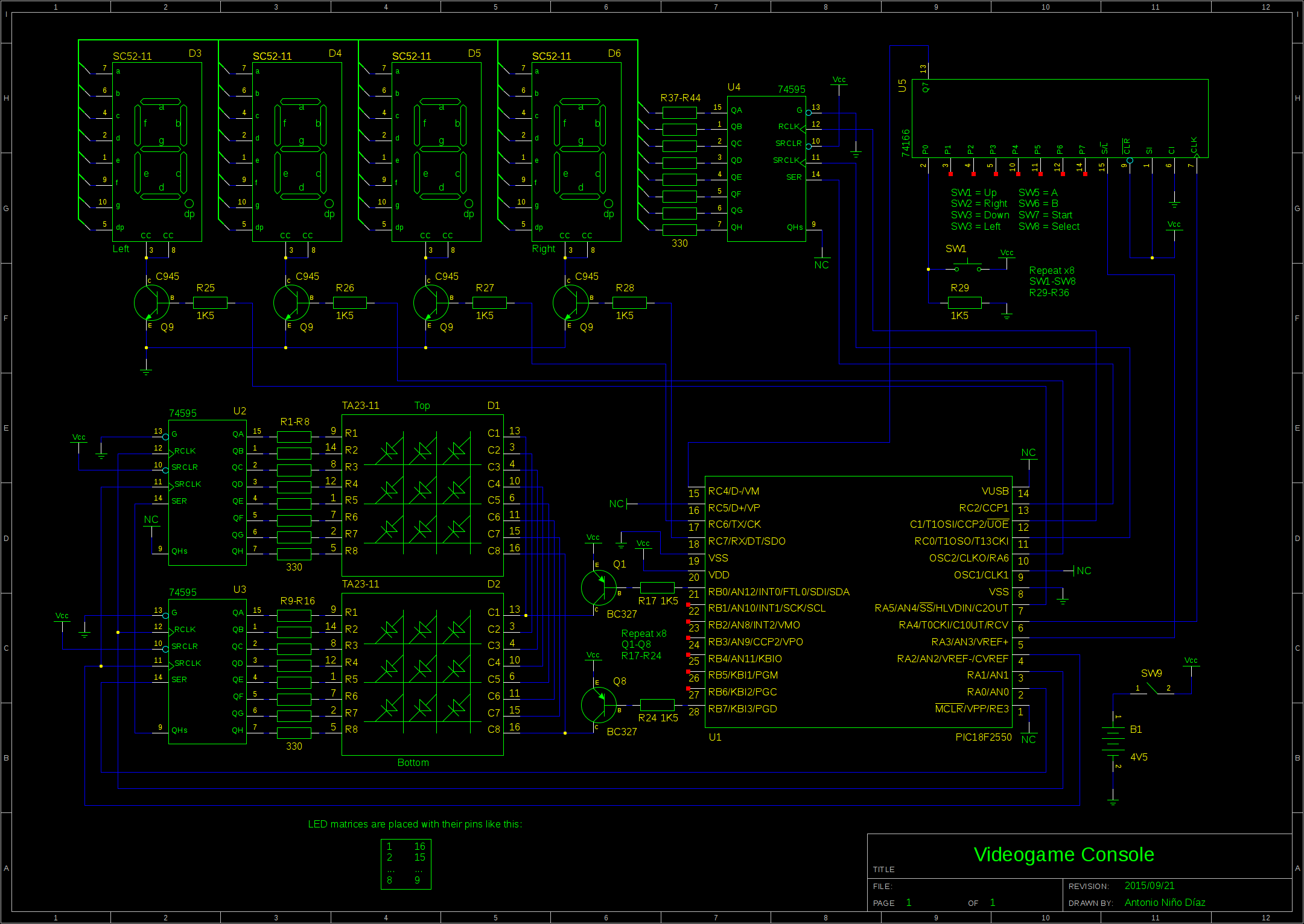 This time I’m writing to show you my newest electronic creation: a “videogame console” made with a PIC18F2550 as its brain. It has a 8x16 LED matrix as main display and 4 seven segment displays to show the player score, for example. It has 8 buttons (4 in a pad, the rest like a Game Boy or similar). The PIC doesn’t have enough pins to control everything easily, so I’ve used a few 74HC595 to control the LED matrix and the seven segment displays, and a 74HC166 to read the state of all buttons.