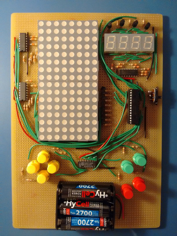 This time I’m writing to show you my newest electronic creation: a “videogame console” made with a PIC18F2550 as its brain. It has a 8x16 LED matrix as main display and 4 seven segment displays to show the player score, for example. It has 8 buttons (4 in a pad, the rest like a Game Boy or similar). The PIC doesn’t have enough pins to control everything easily, so I’ve used a few 74HC595 to control the LED matrix and the seven segment displays, and a 74HC166 to read the state of all buttons.