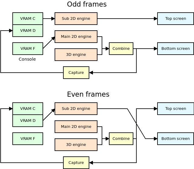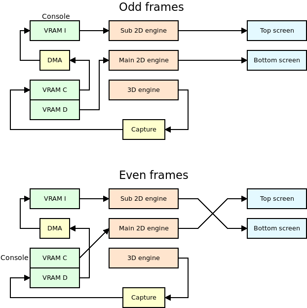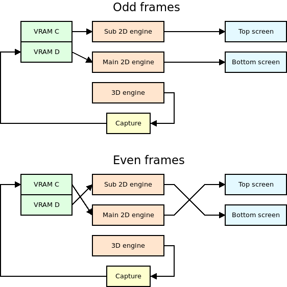 Something that applies to all the systems is that the 3D engine can only send the output to one of the two screens during a specific frame. Any dual 3D setup implies saving that 3D engine output to VRAM and displaying it on the other screen during the following frame. Essentially, the main graphics engine and sub graphics engine need to switch from one screen to the other after every frame.